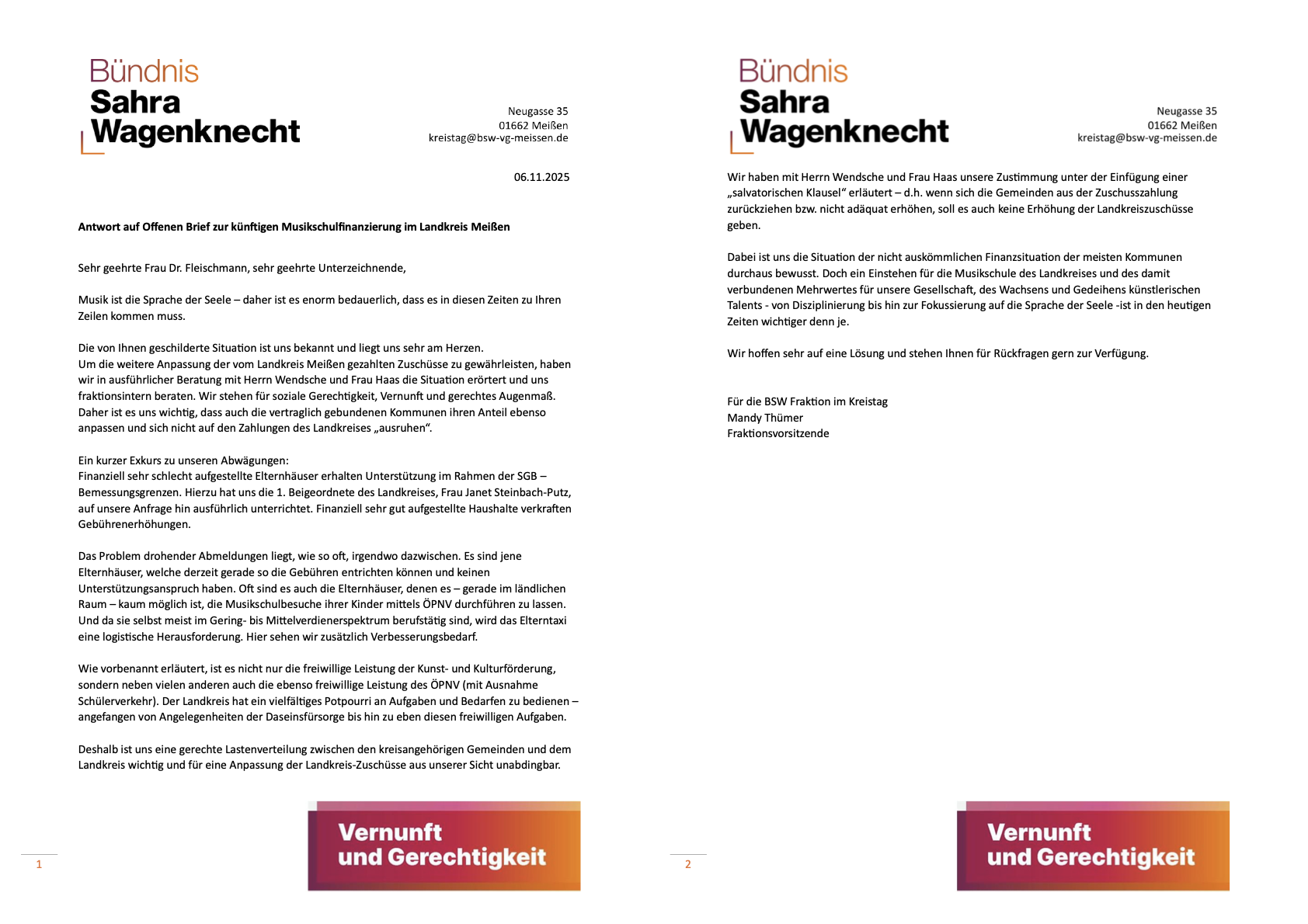 Das BSW im Kreistag Meißen und die BSW-Landtagsabgeordnete Uta Knebel fordern die Beibehaltung aller ICE-Halte in Riesa und die Rücknahme der von der DB AG beabsichtigten Streichung von 10 von 15 dieser Halte zum Fahrplanwechsel zum Winterfahrplan Anfang Dezember. Das BSW bringt in der kommenden Kreistagssitzung eine gemeinsame Resolution mit der CDU-Fraktion ein und wirbt…