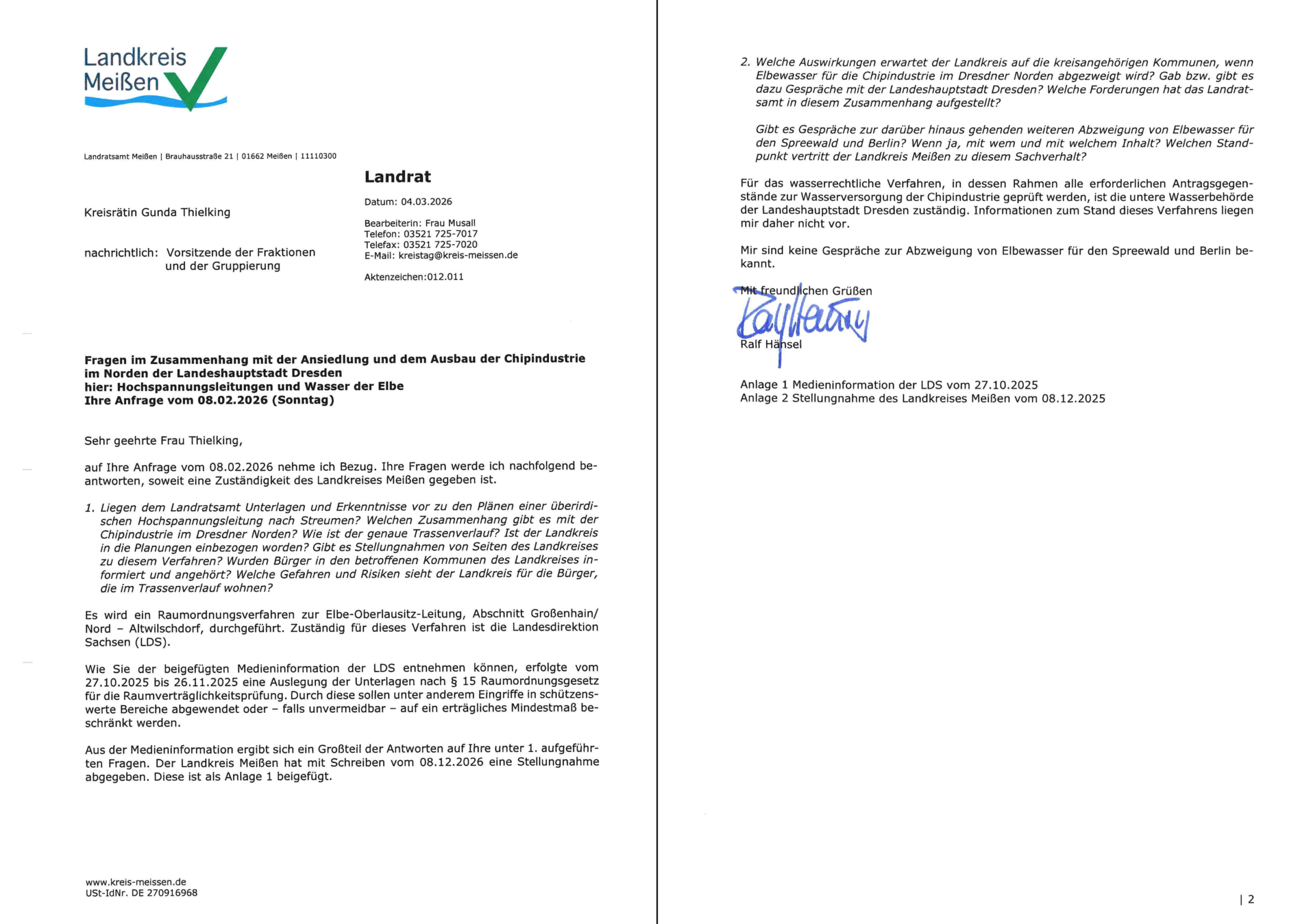 Pressemitteilung – Die Chipindustrie im Dresdner Norden hat einen gewaltigen Energiehunger. Während der Dresdner Stadtrat verständlicherweise gegen Windräder in der Dresdner Heide kämpft, werden die ökologischen Kosten des Energiebedarfs zu Lasten der Menschen ins Umland verlagert. BSW-Kreisrätin Gunda Thielking fragte nach einer Stellungnahme des Landrats zur geplanten überirdischen Hochspannungsleitung, die den gesamten Norden des Landkreises Meißen durchziehen…